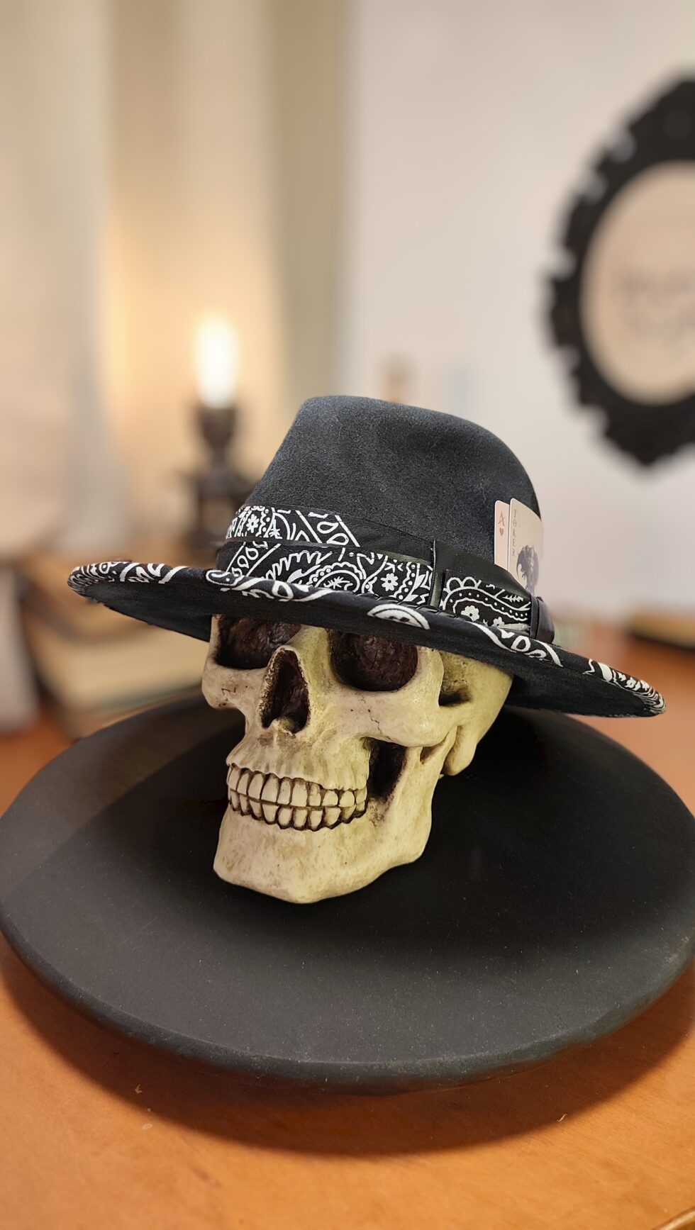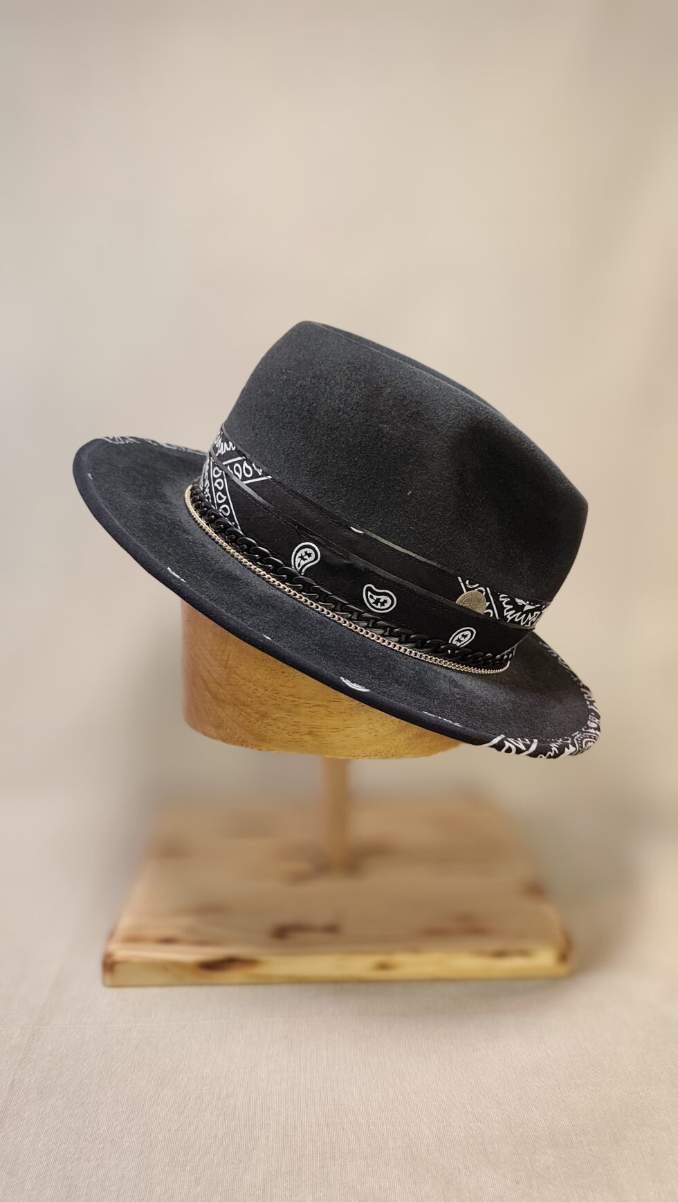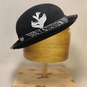 The visual impact of this hat comes from its dramatic contrasts. For instance, the deep black felt body stands out against the white perimeter stitching on the brim. This detail effectively highlights the hat’s sharp, geometric profile. At the base of the crown, I create a dynamic interaction of materials. I use a bandana-style band with white patterns to provide a timeless, alternative foundation.