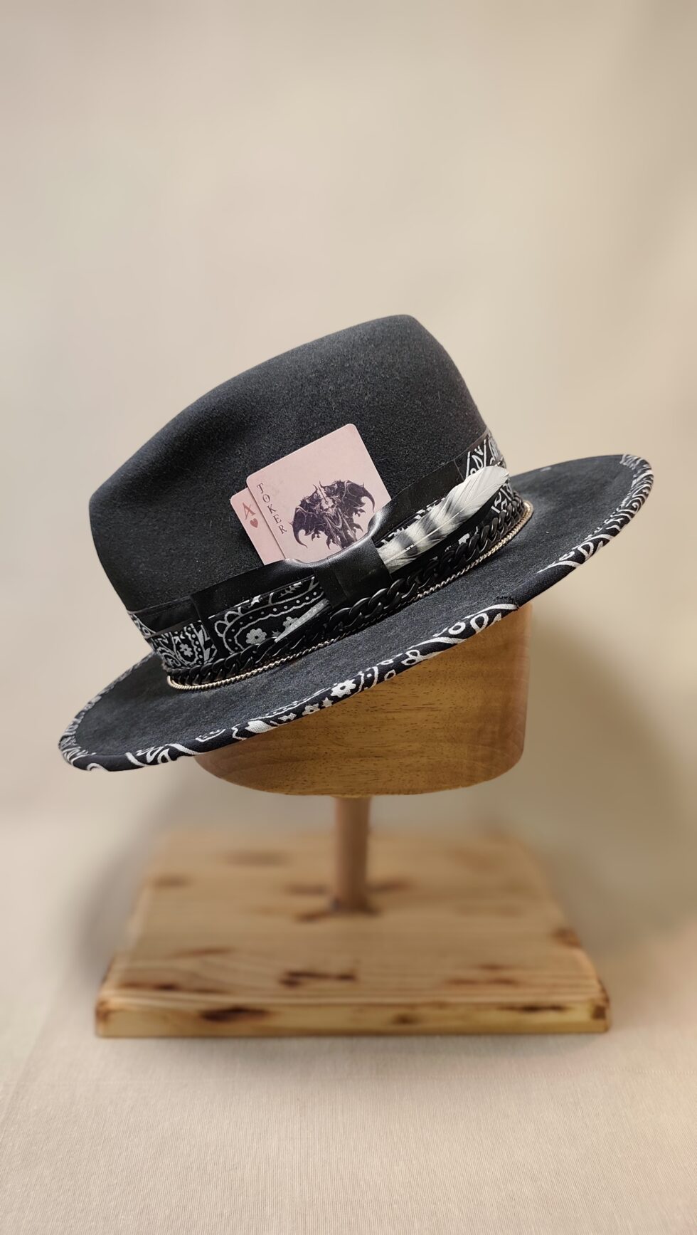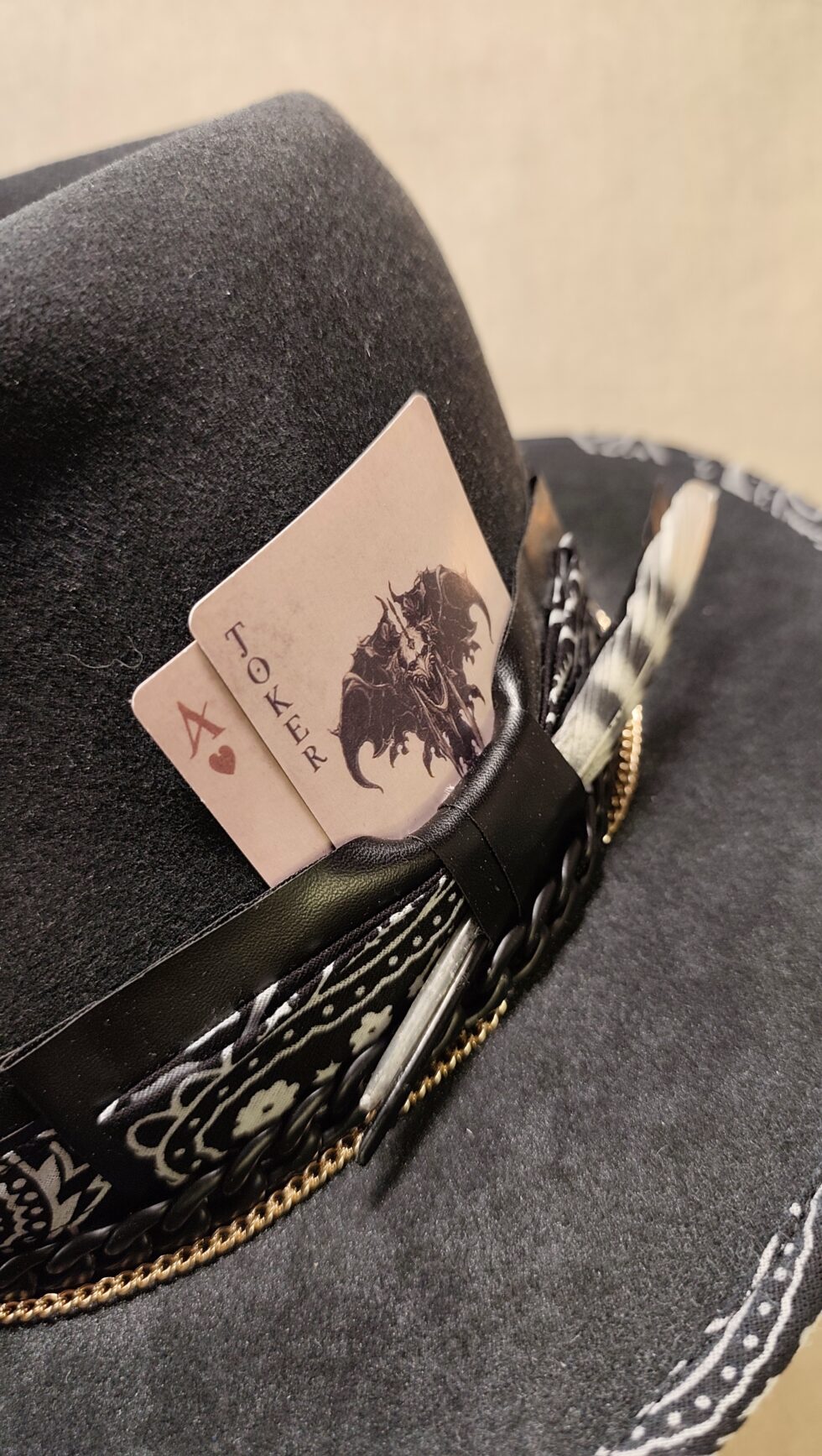 In addition, I overlay stacked metal chains on the band to add a tough, rebellious attitude. A black leather keeper then secures the accessory cluster. I designed this keeper to hold a unique curation of items. These may include selected feathers or a rotating variety of symbolic cards and tokens. Because these details change, every single hat remains a one-of-a-kind creation. Consequently, this fedora will dominate any style you choose.